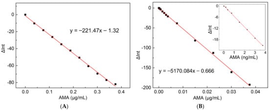 According to the changes of the fluorescence intensity of CB[7]-ABAM system as a function of the concentration of AMA, we plotted two standard curves for determining different ranges of AMA concentration (Figure 4) (the titration graphs are shown in Figures S7 and S8). When the concentrations of CB[7]-ABAM system are 2.0 μM (Figure 4A) and 0.2 μM (Figure 4B), the linear regression equations are y = −221.47x (μg/mL) − 1.32 and y = −5170.084x (μg/mL) − 0.666, respectively (y represents the change value of the fluorescence intensity, x represents the mass concentration of AMA). The correlation coefficients of two equations are 0.998 and 0.999, indicating good linearity. The linear ranges are 0.0375–0.375 μg/mL and 0.000188–0.0375 μg/mL for AMA, respectively. These equations can be directly used for the detection of AMA in real samples according to the change value of fluorescence intensity of CB[7]-ABAM system. With the detection limit as 6.5 × 10−5 μg/mL, this method proved to have higher sensitivity for detecting AMA than any other method reported in the literature (Table 1).