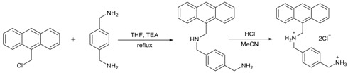 1,4-di(aminomethyl) benzene (0.48 g, 3.53 mmol) and triethylamine (0.45 mL, 3.11 mmol) were mixed in 30 mL dry THF in a flask, stirring at room temperature for an hour. After that, 9-(chloromethyl) anthracene (0.40 g, 1.76 mmol) was added slowly to the solution, and the mixture was refluxed overnight. The mixture was filtered and evaporated to yield a yellow solid, which was purified by column chromatography with a 20:1 mixture of methylene dichloride/methanol. The product (Rf = 0.34) was collected as a pale yellow solid-ABAM (340 mg, 60%). Dissolving the pure product into acetonitrile, bubbling hydrogen chloride gas in the solution, and then a white precipitate formed. The precipitate was collected and dried to give ABAM hydrochloride (390 mg, 94%). 1H NMR (600 MHz D2O) δ (ppm) = 4.12 (s, 2H, CH2), 4.38 (s, 2H, CH2), 5.14 (s, 2H, CH2), 7.42 (m, 2H, CH), 7.44 (d, 2H, CH), 7.43 (t, 2H, CH), 7.52 (t, 2H, CH), 7.92 (d, 2H, CH), 8.05 (d, 2H, CH), 8.60 (s, 1H, CH). 13C NMR (150 MHz D2O) δ (ppm) = 134.18, 130.94, 130.84, 130.27, 130.03, 129.67, 129.46, 129.18, 127.35, 125.27, 121.78, 119.78, 50.15, 42.59, 40.65. ESI-MS (positive ion): m/z 327.19 [ABAM + H+]+ (calcd. C23H23N2+ 327.18).