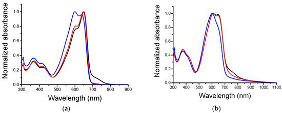 Normalized UV-Vis absorption spectra of the P1 (red) P2 (blue) and P4 (black) in solution (a) and as thin film on glass (b).