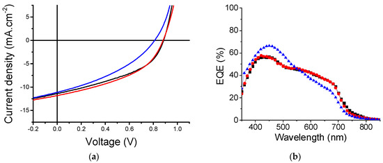 This behaviors was particularly highlighted in the external quantum efficiencies (EQE) spectra since both responses are almost superimposable. Moreover, it also appears that the possible DPP homo coupling defects, emphasized in P4 in the long wavelengths, have negligible effects on the photovoltaic characteristics [30,38]. On the other hand, although similar short circuit currents (Jsc) of ca. 11 mA·cm−2 were recorded in the three cases, a different spectral response was monitored for P2 resulting from an improved contribution in the acceptor region (400–500 nm) that compensates the lower photo conversion assigned to the polymer (550–700 nm).