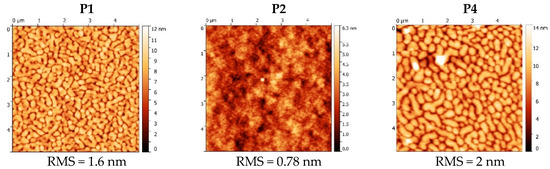 Atomic force microscopy (AFM) surface topography images of the P1, P2 and P4 based optimized active layers (RMS = Root Mean Square).