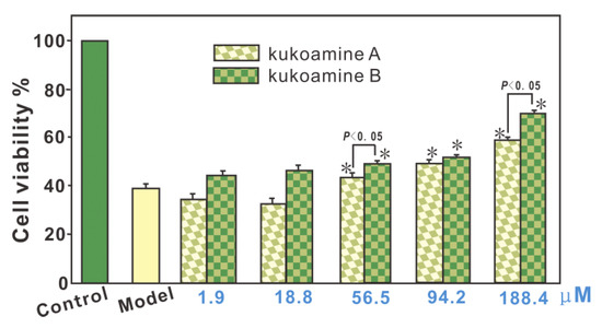 Protective effects of kukoamine A and B against Fenton-induced damage in bmMSCs, as measured in the MTT assay. These data represent the mean ± SD (n = 5). * p < 0.05 vs. model. The Fenton reagent (FeCl2 plus H2O2) was used to generate •OH radicals. MTT, 3-(-dimethylthiazol-2-yl)-2,5-diphenyltetrazolium bromide.