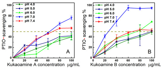 Our previous study pointed out that such cytoprotective effects are usually related to antioxidant (especially ROS-scavenging) effects [20]. In order to explore this possibility, we performed a PTIO• assay, a simple method newly developed by our team [21]. Similar to cellular ROS (e.g., •OH or •O2−), a PTIO• radical is an oxygen-centered radical. However, it can exist stably in aqueous solution (or buffer), and PTIO• scavenging can be easily measured in chemical solutions (or buffer). As shown in Figure 3, both kukoamine A and B showed concentration-dependent increases in PTIO• scavenging up to 100 µg/mL. These data indicated that kukoamine A and B could directly scavenge ROS, and direct ROS-scavenging may be one of the mechanisms in their antioxidant action.