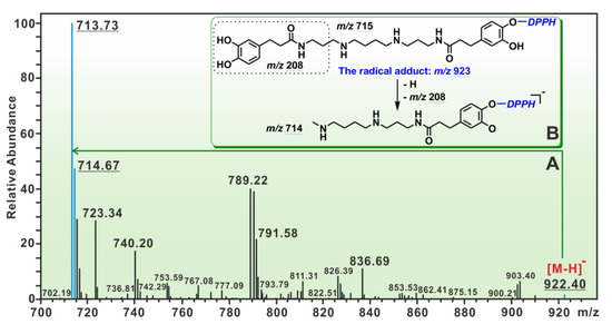 To explore the RAF possibility, the reaction mixture of kukoamine A with DPPH• was investigated using HPLC–ESI–MS/MS analysis. Two MS peaks (m/z 922, 713) relevant to RAF have been found (Figure 5A). The peak at m/z 922 was proposed to be the molecular ion peak of the kukoamine A-DPPH• adduct; while the peak at m/z 713 was its fragment (Figure 5B). However, the observed peak strengths were very low. In the product of kukoamine B with DPPH•, however, no RAF was observed by HPLC–ESI–MS/MS analysis. These data suggest that the RAF reaction served as a minor antioxidant mechanism [30].
