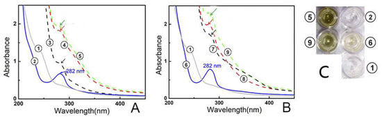 The experimental results of UV-vis-spectra analysis of Fe2+-chelation with kukoamine A and B. (A) kukoamine A; (B) kukoamine B; (C) solution appearances. (①151.0 mmol/L Fe2+; ② 0.2 mmol/L kukoamine A; ③ reaction mixture of 151.0 mmol/L Fe2+ with 0.2 mmol/L kukoamine A for 0 min; ④ reaction mixture of 151.0 mmol/L Fe2+ with 0.2 mmol/L kukoamine A for 30 min; ⑤ reaction mixture of 151.0 mmol/L Fe2+ with 0.2 mmol/L kukoamine A for 60 min; ⑥ 0.2 mmol/L kukoamine B; ⑦ reaction mixture of 151.0 mmol/L Fe2+ with 0.2 mmol/L kukoamine B for 0 min; ⑧ reaction mixture of 151.0 mmol/L Fe2+ with 0.2 mmol/L kukoamine B for 30 min; ⑨ reaction mixture of 151.0 mmol/L Fe2+ with 0.2 mmol/L kukoamine B for 60 min).