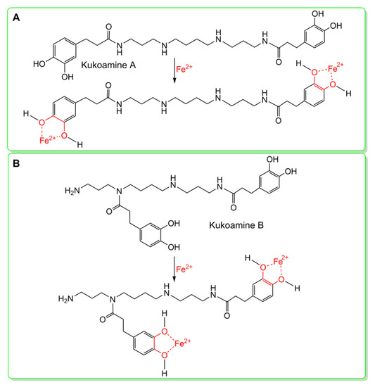 The proposed chelation reactions of kukoamine A (A) and kukoamine B (B) with excessive Fe2+.