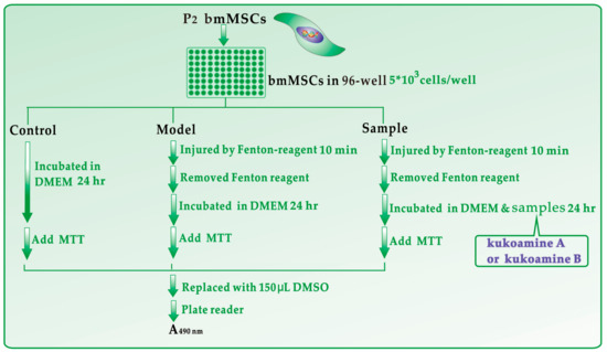 bmMSCs culture was carried out according to our previous report [39] with slight modifications. bmMSCs at passage 3 were detected for cell homogeneity based on CD44 expression by flow cytometry (Figure 8). The protective effect of kukoamines against •OH radical-induced bmMSCs damage was evaluated using the MTT assay [40]. The experimental protocol is briefly illustrated in Figure 9.
