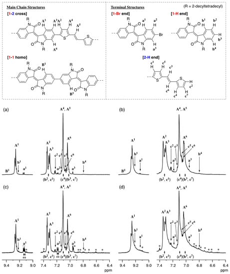 1H-NMR spectra of poly(1-alt-2) prepared via DArP (Mn = 15,700 (a) and Mn = 22,700 (b)) and Migita–Kosugi–Stille cross-coupling polymerization (Mn = 17,700 (c) and Mn = 24,400 (d)) in C2D2Cl4 at 130 °C (600 MHz). *: unidentified signals.