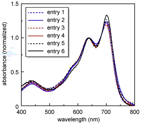 Table 2 summarizes the optical and electrochemical properties of poly(1-alt-2)s, in thin film, which were evaluated by UV–vis spectroscopy and cyclic voltammetry. The absorption spectra of poly(1-alt-2)s, listed in Table 2, are shown in Figure 2. All spectra consist of two absorption bands around 600–700 (band I) and 650–750 nm (band II). The band I arises from the intramolecular charge transfer (ICT) transitions in the donor–acceptor units, whereas the band II is induced for the aggregation of polymer chains through strong intermolecular interactions [29]. In Figure 2, the changes in the relative intensity, from band II to band I, are small. The maximum absorption wavelengths of polymers are approximately the same (λmax = 638(3) and 700(2) nm). Moreover, the absorption onsets (λonset) are within the range of 746–753 nm, showing that the optical band gaps are little affected by the polymerization methods, as well as the molecular weight (Egopt = 1.66(1) eV). Indeed, the electronic properties evaluated by cyclic voltammetry are consistent for all polymers: EHOMO = −5.34(2) eV, ELUMO = −3.60(3) eV, EgCV = 1.74(2) eV.