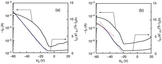 Charge transfer characteristics of the OFETs using poly(1-alt-2) of entries 1 (a) and 5 (b) in Table 3 (VD = −60 V).