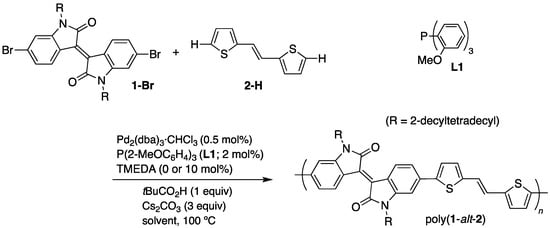 - Iizuka, E.; Wakioka, M.; Ozawa, F. Mixed-Ligand Approach to Palladium-Catalyzed Direct Arylation Polymerization: Synthesis of Donor–Acceptor Polymers with Dithienosilole (DTS) and Thienopyrroledione (TPD) Units. Macromolecules 2015, 48, 2989–2993. [Google Scholar] [CrossRef]
