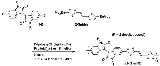 For comparison, poly(1-alt-2) was prepared by Migita–Kosugi–Stille cross-coupling polymerization (Scheme 2). Referring to the literature [22,23], the reactions of 1-Br and 2-SnMe3 were examined in toluene under two catalytic conditions. The reaction in the presence of Pd2(dba)3·CHCl3 (2 mol%) and P(o-tolyl)3 (8 mol%) at 90 °C for 24 h yielded poly(1-alt-2) with moderate molecular weight (Mn = 17,700, PDI = 1.7) in quantitative yield [22]. Although the GPC molecular weight of the polymer prepared under those reactions conditions has been reported to be Mn = 98,800 (PDI = 3.1), this value has been estimated at 40 °C, using CHCl3 as the column eluate [22]. In contrast, we performed GPC calibration at 140 °C, using o-Cl2C6H4. Thus, we re-examined the polymer under the same GPC conditions using CHCl3 and confirmed that our product (Mn = 93,400, PDI = 4.6) has comparable molecular weight to that of the literature.