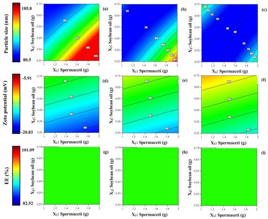 Generally, in recent decades to the present-day, nanoparticle research in the pharmaceutical field focused on two physical important factors that must be examined: particle size and zeta potential. In this study, in Table 1, the particle size of TA-loaded NLCs was lower than 200 nm and is displayed in the size range 80.5–185.8 nm. Figure 2 shows the contour plot for the effect of the concentration of spermaceti, soybean oil, and Tween 80 on the particle size. The increase in the spermaceti concentration and concentration of Tween 80 was fixed, leading to a great increase in the particle size. In contrast, with an additional amount of soybean oil and a fixed concentration of Tween 80, the particle size was reduced. The result was associated with another report that increased the amount of liquid lipid and saw the size of the particle decrease. These appearances may be due to the reduction in the viscosity of the internal phase [9]. Nevertheless, other factors may affect this appearance, such as the chemical interaction of components or the molecular structure of the lipids used [12]. The larger blue area in the contour plot of Figure 2c than in Figure 2a,b shows that the particle size was smaller when the concentration of the Tween 80 that increased. The result correlated with the result of increasing the amount of liquid lipid: the particle size was smaller when it was higher. The increase in the amount of non-ionic surfactant that provided the TA-loaded NLCs with a smaller size may be due to the decrease in the interfacial tension between the oil and aqueous phases, resulting in the smaller size of droplet formation [9,14].