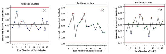 The corresponding residual plot between the run number and the internally studentized residuals for various responses of particle size (a); zeta potential (b); and % EE (c).