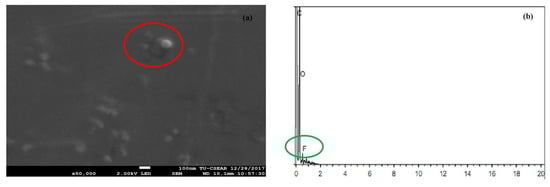 FESEM was used to investigate the morphology and size of the particles from TA-loaded NLCS (see Figure 4). The N2 formulation was selected to be examined in this study and showed quite a spherical shape in the nanosize range. Each particle size of the nanoparticles was around 100 nm and correlated with the result of the measurement using the light scattering technique as explained in the previous section. The particles in the red circle area (only particles) of Figure 4a were detected using EDS to confirm TA could be incorporated in the NLC system. The result in Figure 4b shows the characteristic peak of fluoride (F, in green circle) of the TA structure. From the composition of the NLCs formulation, only the active ingredient displays fluoride elements in the molecular structure, see Figure 1. The TA might be loaded in NLC or attached outside the layer of NLCs. Therefore, the result could suggest that the TA could be loaded in the NLC system and it could form the nanoparticle.