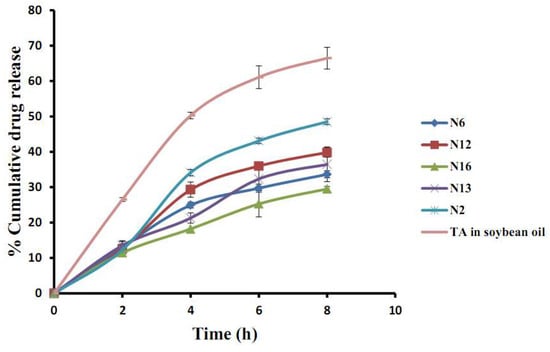 The in vitro release of TA from the NLC dispersion in the period of 0–8 h varied from 0% to 66.5%, see Figure 5. The formulations of N2, N6, N12, N13, N16, and TA in soybean oil were selected in this study to compare the effect of concentration of spermaceti (N2 and N16), soybean oil (N6 and N12), Tween 80 (N12 and N13), and TA-loaded NLCs selected in this section with TA in soybean oil. In the early release period at 2 h, the release of TA from the NLC dispersion of all formulations did not differ significantly (p > 0.05), but the formulation of TA in soybean oil showed a great release of TA in that period of time and it released considerably more of all the TA-loaded NLC formulations until 8 h. The result suggested that TA could be incorporated in the NLC system because they were lower release when compared with TA in soybean oil. The mechanism of the NLCs release involved two different states; first, the immediate release of nanoparticles from the surface of the NLCs and next, the diffusion through the NLCs which was the predominant release mechanism [27]. TA-loaded NLCs of N12 with a higher amount of soybean oil than N6 had a higher cumulative release after 2 h. Similar findings were present in other reports [12,26]. The result could be explained by the cooling process of the NLCs preparation after the ultrasonic method. In the period of the cool down process of NLC dispersion, the high melting point of solid lipid (spermaceti) rapidly changed to form a solid lipid matrix while the liquid lipid (soybean oil) became embedded in a solid lipid matrix or distributed around the surface of the matrix. The matrix of the particle is composed of imperfections, giving space to contain the drug in amorphous sections [26,28]. The result of the higher amount solid lipid supported this appearance: the higher amount of solid lipid in formulation N16 showed the lower cumulative release than the formulation contained in the lower amount of solid lipid in formulation N2. It could be concluded that the concentration of solid and lipid to form TA-loaded NLCs had a crucial influence on the release profile of the drug. The increase in the amount of surfactant in formulation N12 than N13 showed a higher release profile after 2 h of this experiment. It could be described by the addition of the surfactant leading to improve dispersity and solubility of a hydrophobic drug providing a higher release rate in the SSF medium. Table 2 shows the release kinetics model of the TA from selected NLC formulations. The suitable mathematical release models chosen for the release pattern were zero-order, first-order, and Higuchi models. A maximum of the correlation coefficient (R2) was used to select a model appropriate for analyzing the TA release patterns. The Higuchi model gave the highest value of the R2, indicating that this model was a fit for the TA release profiles and correlated with another report of NLCs formulation [9]. So, the release patterns of the TA-loaded NLCs fit with the Higuchi model suggests drug release by diffusion [29].