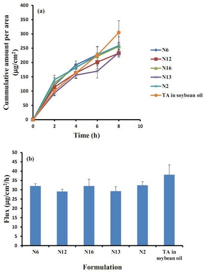 The in vitro permeation profiles (cumulative amount per area (a) and steady-state flux (b)) of TA-loaded NLCs and TA in soybean oil.