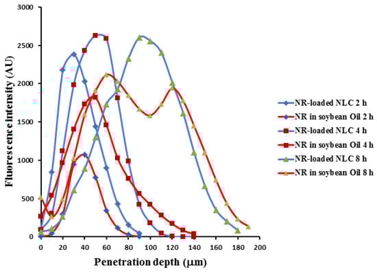 CLSM was used to observe the drug penetration within porcine buccal mucosa (see Figure 7). TA-loaded NLCs in formulation N2 were selected for study in this experiment compared with TA in soybean oil by changing the active ingredient (TA) in each formulation to Nile red as equal concentration (0.1% w/w). Before beginning the test, the porcine buccal mucosa without Nile red was used to test the auto-fluorescence response from the mucosa. It could be observed that there was no auto-fluorescence response from the mucosa at the range of excitation and emission wavelength as used (data not shown). The penetration of NR-loaded NLCs in 2 h and 4 h could be observed at the maximum depths of 90 and 140 µm as well as the result of NR in oil. However, the fluorescence intensity of NR-loaded NLCs at the same time was higher than NR in oil in both times, as Figure 8 shows. The result supported the data of the in vitro permeation studies section, that the cumulative amount per area in 4 h of the permeation study of TA-loaded NLCs was higher than the TA in soybean oil. The maximum penetration depths of NR-loaded NLCs and NR in oil in 8 h were 180 and 190 µm, as we see in Figure 8. Nevertheless, the maximum fluorescence intensity of NR-loaded NLCs was also higher than NR in oil at 8 h. After a penetration depth of 120 µm, the fluorescence intensity of NR-loaded NLCs was lower than NR in oil. The result was in line with the previous section of the permeation study: after 6 h, the TA in soybean oil had a higher permeation through buccal mucosa than the TA-loaded NLC formulations. It could be concluded that the rate-limiting steps of NLCs penetration efficiency through porcine buccal mucosa was time and penetration depth. However, other factors may be involved in the penetration rate, such as the lipophilicity of the drug, the size, the net charge, the hydrogen bonding potential, and the structural conformation [5].