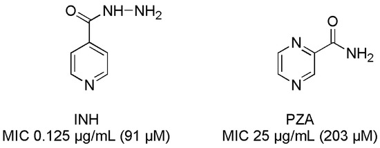 Structure and tuberculostatic activity of isoniazid (INH) and pyrazinamide (PZA).