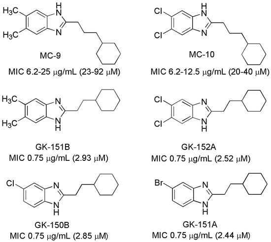 Subsequent studies gave derivatives of 2-(2-cyclohexylalkyl)-1H-benzo[d]imidazole. Among them, there were the most active compounds that contained two methyl groups in C-5 and C-6 positions of the benzimidazole system (Figure 2). The MIC values of these compounds were 0.8–6.2 µg/mL [16,17]. At the same time, the compounds exhibited low cytotoxicity against human epidermal neonatal fibroblasts (ATCC PCS-201-010) [15,17]. Thus, because of their high tuberculostatic activity and low cytotoxicity these compounds were considered as very good candidates for tuberculosis drugs, although the mechanism of their action remained unknown.