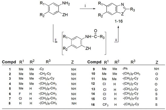 Synthesis of benzimidazoles 1–9, benzoxazoles 10–13, and benzothiazoles 14–16.