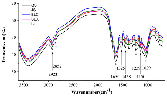 In this study, five famous brands of green tea, Queshe (QS), Jingshan (JS), Biluochun (BLC), Sanbeixiang (SBX), and Longjing (LJ), were used in the experiments. Figure 1 shows the spectral profiles of all samples, from 3582 to 689 cm−1, and the main absorption peaks are marked with their wavenumber values. It can be found that the spectral profiles of the samples, for different brands, are quite similar. The main large peaks of 1650, 1525, 1458, 1239, 1150, and 1039 cm−1 could be detected in the fingerprint region of the FT–IR spectra. In detail, the peak around 1650 cm−1 could be the vibration of the amide I (N–H bending), the peak around 1525 cm−1 is related to the band of the amide II, and the peak of 1239 cm−1 is assigned to the amide III band [23,24]. The peak at 1150 cm−1 is assigned to the anti-symmetric stretching of the C–O–C bridge [25]. The spectral responses near 2923 cm−1 and 2852 cm−1 are associated with anti-symmetric and symmetric C–H stretching vibrations of methylene (CH2) groups, respectively [26]. In addition, the presence of the band at 1458 cm−1 is caused by the symmetric bending mode of methylene groups [27].