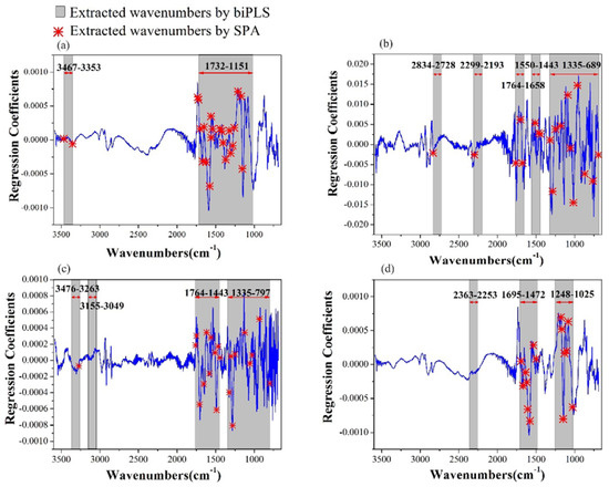 Weighted regression coefficients of PLS models and the extracted wavenumbers by biPLS and SPA for (a) Chl-b; (b) Chl-a; (c) Phe-b; (d) Phe-a.