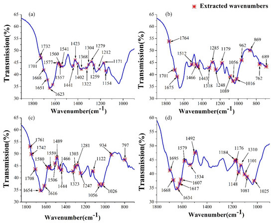 In this study, a Fourier transform infrared (FT–IR) spectrometer (Thermo ScientificTM NicoletTM iSTM 10, Madison, WI, USA) was adopted for collection of samples’ FT–IR spectroscopy in transmittance mode. The range of this spectrometer was 7800–349 cm−1, with a resolution of 4 cm−1 and the sampling interval of 0.96 cm−1. Each sample was scanned 32 times and an average spectrum was taken as a representative of the sample. The whole operation was processed at about 25 °C and in a dark environment.