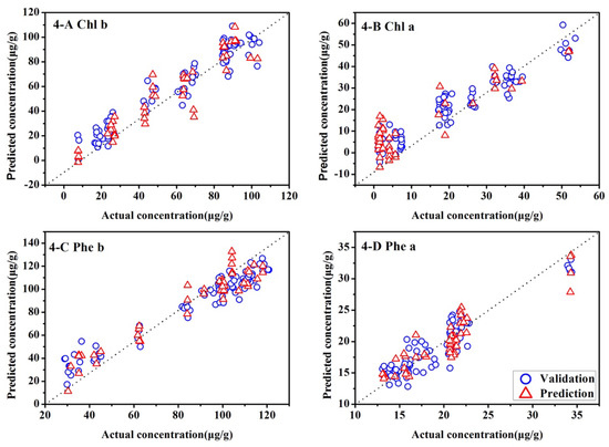 As shown in Table 2, SNV provides a preferable result relative to that based on the original data. In detail, the R2P of Chl-b, Chl-a, and Phe-b were improved to 0.76, 0.78 and 0.91, respectively. The models based on SNV are more stable when the gap between the R2P and R2V decreases. Consequently, the SNV pretreatment was used to build models 1-A, 1-B, 1-C and 1-D for Chl-b, Chl-a, Phe-b, and Phe-a, respectively.