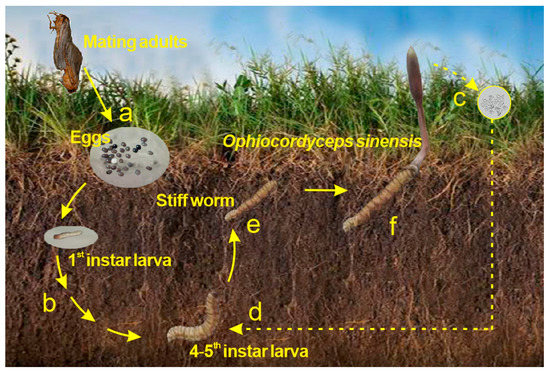 - Guo, L.X.; Hong, Y.H. Fungus-larva relation in the formation of Cordyceps sinensis as revealed by stable carbon isotope analysis. Sci. Rep. 2017, 7, 7789. [Google Scholar] [CrossRef] [PubMed]