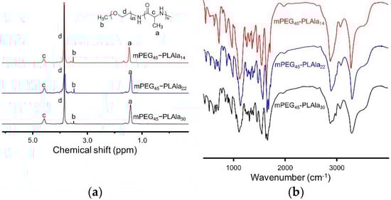 The typical proton nuclear magnetic resonance (1H-NMR) spectrum of block copolymer is shown in Figure 1a, and all peaks could be accurately assigned. The peaks at 1.47, 3.40, 3.50–3.80, and 4.64 ppm stood for the protons of alanine methyl, mPEG terminal methoxy, mPEG backbone, and polymer methine, respectively, indicating the successful synthesis of the three polymers.