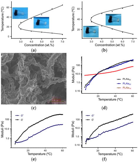 Gelatinization characteristics of mPEG45−PLAla. (a) Solution–gel phase diagrams of the mPEG45−PLAla30 and (b) mPEG45−PLAla22 copolymer solutions; (c) Scanning electron microscope (SEM) image of mPEG45−PLAla30 hydrogels formed at 40 °C; (d) G’ of the mPEG45−PLAla30 (PLAla30), mPEG45−PLAla22 (PLAla22), and mPEG45−PLAla14 (PLAla14) at the concentration of 5.0 wt. % in phosphate-buffered saline (PBS) solution; (e) Changes of G’ and G” of mPEG45−PLAla30 and (f) mPEG45−PLAla22 in PBS solutions (5 wt. %).
