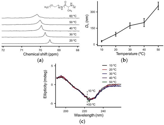 In order to study the mechanism of sol–gel transition, the nuclear magnetic peak changes, diameter changes, and conformation evolution of polypeptides in response to temperature were tested by carbon nuclear magnetic resonance (13C-NMR), dynamic light scattering (DLS), and circular dichroism (CD). As shown in Figure 3a, when temperature rose from 20 to 60 °C, the characteristic peak of PEG gradually moved from 69.7 to 70.3 ppm, which revealed continuous dehydration of the PEG block during the heat-induced sol–gel transition process. Two main reasons accounted for the gelation of polymers. First, the interaction between hydrophobic blocks became stronger as temperature increased. Secondly, dehydration of PEG segments facilitated the aggregation of the hydrogels [38].