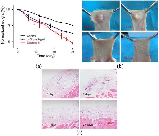 Degradation of hydrogel in vitro and in vivo, and histological analysis of skin. (a) Mass loss curves of in vitro degradation of hydrogels in PBS, and PBS with elastase-K or α-chymotrypsin (0.2 mg mL−1) groups; (b) Images of in vivo gel maintenance at 10 min, 7, 14, 21, and 28 days after the injection of 5.0 wt. % mPEG45−PLAla30 hydrogels; (c) Hematoxylin and eosin (H&E) images of the skin tissue near the hydrogels on day 7, 14, 21, and 28, respectively.