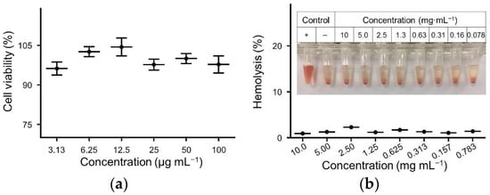 Biological compatibility of mPEG45−PLAla30. (a) In vitro cytotoxicity of the mPEG45−PLAla30 toward L929 cells. Data were presented as mean ± SD (n = 5); (b) Hemolysis experiments of mPEG45−PLAla30. Data are presented as mean ± SD (n = 3).