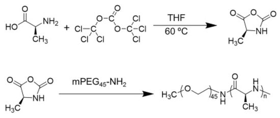 Synthetic routes of l-alanine N-carboxyanhydrides (l-Ala NCA) and methoxy poly(ethylene glycol)−poly(l-alanine) (mPEG45−PLAla).