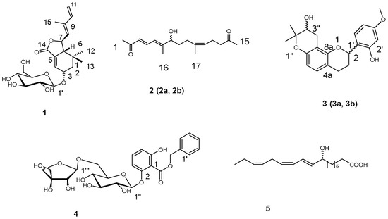 Aldose reductase is the first and rate-controlling enzyme in the polyol pathway that reduces glucose into sorbitol and then fructose. Intracellular excess sorbitol is thought to lead to diabetic complications, including neuropathy, nephropathy, retinopathy, and cataract [9]. Fructose can lead to the formation of 3-deoxyglucosone, a key intermediate known to accelerate the formation of Advanced Glycation End products (AGEs) [10]. The presence and accumulation of AGEs contribute to the development of atherosclerosis and promotes renal damage, diabetic nephropathy, and a series of cancers [11,12,13,14]. Besides reducing glucose, aldose reductase is also involved in the reduction of oxidative stress-generated lipid aldehydes and their conjugate with GSH, which can alter cellular signals by mediating transcription factors such as NF-Kb and AP1 [15]. Aldose reductase inhibitors have been shown to be an effective multi-disease target to prevent diabetic complications, cancers, cardiovascular diseases, and inflammatory complications [16]. This study investigated the acetone and chloroform fractions of the ethanol extract of the leaves of M. alba L., which showed effects against diabetes and human cancer cell lines in our previous study, leading to the identification of four new structures, namely a sesquiterpenoid glucoside 1, an aromatic glucoside 2, a farnesylacetone derivative 3, a flavan 4, and a known compound, (9R)-hydroxyl-(10E,12Z,15Z)-octadecatrienoic acid (5). In addition, we report the results of aldose reductase inhibitory and neuroprotective activity evaluations.