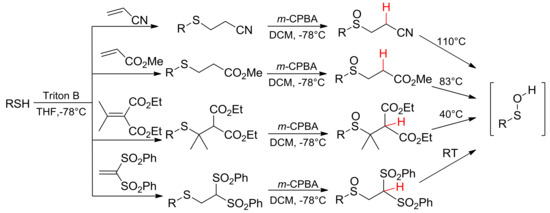 The synthetic route to the sulfinyl precursors of sulfenic acids generally involvesthe following two steps: the nucleophilic conjugated addition of a thiolate to an α,β-unsaturated compound, and the subsequent oxidation of the obtained thioether to sulfoxide by means of m-CPBA. Electron-withdrawing groups linked to the β carbon atom and/or sterically demanding groups on the α carbon atom are needed to enhance the mobility of the β-H and, hence, to modulate the thermolysis temperature (Scheme 2) [17,18]. Tuning of the thermolysis mildness and lack of acidic or basic conditions allow for the generation of sulfenic acids bearing labile R residue, not obtainable in different processes.
