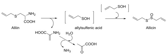 The use of natural products for medicinal purposes is an ancient and still applied practice that joins and completes the process of discovery and development of new drugs in which the pharmaceutical industry is involved. Alliin is a l-cysteine-derived sulfoxide, generated from freshly cut or crushed garlic [10], which has been extensively studied for its anti-inflammatory and antioxidant properties [25] because it lowers blood sugar [26], increases the concentration of insulin in the blood, and recently also because it improves lipogenesis [27]. Based on Granroth’s work [28], S-allilcysteine, generated by glutathione, is oxidized to alliin, then is enzymatically hydrolyzed to produce allylsulfenic acid (Scheme 4). This transient intermediate auto-condenses to allicin, a thiosulfinate with many different biological properties [29], responsible for the typical smell and taste of garlic.