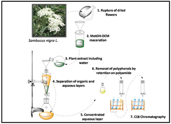 Here, our strategy involved immersing the plant material in a DCM-MeOH mixture (1:1, v/v) and leaving it overnight at room temperature, a procedure that is widely used for peptide extraction [10]. However, after water addition, the aqueous layer contained large amounts of polyphenols (0.987 mg/mL). In fact, elder trees contain elevated amounts of polyphenolic compounds [17,18,19,20]. Thus, polyamide resin should be used for their removal because strong hydrogen bonding occurs between polyphenolics and polyamide, but peptides are not retained on this column support [21].