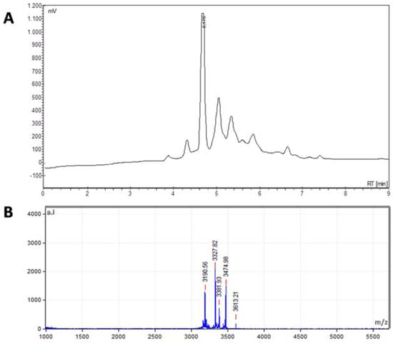 Characterization of peptide extract from flowers of S. nigra. (A) HPLC spectra of 40% acetonitrile (ACN) fraction of flowers peptide extract; (B) Matrix-Assisted Laser Desorption Ionization-Time of Flight Mass Spectrometer (MALDI-TOF) MS spectra of the 40% ACN fraction of flowers peptide extract.