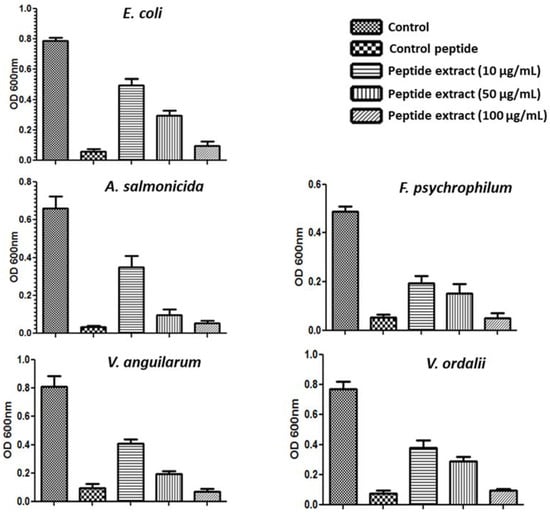 Antimicrobial resistance in traditional fish farming has been widely studied [29,30,31,32]. Fish farms are an environmental reservoir of antibiotic resistance genes, because excess food containing antibiotic is deposited in the seabed. In this regard, residues of antimicrobials have been found in the sediments of marine fish farms [33]. Furthermore, 80 gram-negative strains that were isolated from water samples of Chilean salmonid farms have been reported [34]. For this reason, some plant extracts have been evaluated against a number of fish bacterial pathogens [35,36,37]. Here, the activity of the peptide extract from S. nigra flowers was evaluated against A. salmonicida, F. psychrophilum, V. anguillarum, and V. ordalii, all of them Gram-negative bacterial pathogens that were found in salmon aquaculture in Chile. Microplate assays showed the capacity of the extract to reduce the growth of all pathogens (Figure 3). The strongest antimicrobial effect was observed at a concentration of 100 μg/mL of the peptide extract.