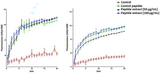 One of the few conserved characteristics of AMPs is their cationic and hydrophobic composition [38]. This makes them well suited for interacting with anionic surfaces of microbial membranes, which typically present a high content of lipids, such as phosphatidylglycerol, cardiolipin, lypopolysaccharides, and teichoic acids [39,40,41]. Several models for the interaction of AMPs with the membranes, such as “barrel stave”, “toroidal pore”, or “carpet model” have been postulated [42]. In the carpet model, the peptides form a layer of “carpet” that induces membrane weakness, which ultimately ends with membrane collapse by a detergent-like action. According to this mechanism, peptides affect the local curvature of the bilayer in a cooperative manner, such that a toroid of high curvature is formed [43,38]. The effect of the peptide extract from S. nigra on the bacterial membrane integrity of E. coli and A. salmonicida was analyzed. This is usually studied by using a fluorescent nucleic acid stain, such as SYTOX Green, which is impervious to living cells [44]. Phospholipase-A2-derived synthetic peptide was used as a positive control, because its action on bacterial membranes has been previously described [45]. As expected, a strong increase in fluorescence occurred after treatment with the control peptide for 2 min (Figure 4). Interestingly, treatment with 50 μg/mL or 100 μg/mL of peptide extract showed similar results, with early increasing fluorescence (Figure 4).