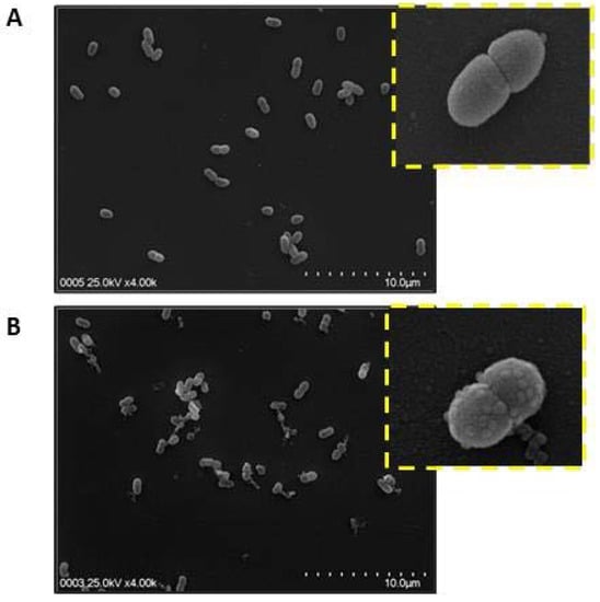 In addition, a direct visualization of bacterial membrane damage following treatment with the peptide extract was obtained by scanning electron microscopy (SEM) (Figure 5). The SEM images of A. salmonicida (at mid-logarithmic growth phase) that were treated with the peptide extract showed membrane damage with multiple blisters. Moreover, intracellular contents were released in the bacteria, accompanied by membrane blebbing, suggesting membrane disruption as the mechanism of action of these peptides (Figure 5B). Thus, the SEM images suggest that peptides from S. nigra flowers use a carpet mechanism to kill bacteria, because the presence of membrane blebbing is associated with this model [46,47,48]. Nevertheless, future studies are necessary for identifying interactions of AMP from S. nigra flowers with the bacterial membrane components to understanding the antimicrobial mechanisms of these AMPs [49].