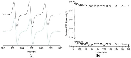 To confirm the radical nature of 5 and 7, their X-band EPR spectra were first measured in a pure phosphate buffered solution (PBS) with 10 vol % of dimethyl sulfoxide (DMSO) and without a reduction agent. As seen in Figure 1a, the EPR spectrum of 5 shows a triplet pattern, arising from 14N hyperfine splitting, with an isotropic hyperfine coupling constant (IHCC) of 46 MHz and giso-value of 2.0057. A similar spectrum and parameters (aN = 49 MHz and giso = 2.0055) were also obtained for 7 (Figure S2). Observed peak patterns, IHCCs and giso-values for 5 and 7 are in line with previously reported values for analogous nitroxide radicals [29,30].