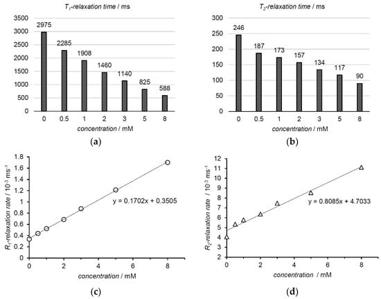 The results of the 1.5 T phantom MRI study at ambient temperature (22 °C) indicated improved contrast between different samples with varying nitroxide concentrations. This is visible in T1-weighted fast low angle shot (FLASH) image (Figure 3a). Also inversion-recovery T1- and multiecho T2-maps emphasized the differences in relaxation times (Figure 3b,c). In accordance to the 11.7 T NMR data, the T1- and T2-relaxation times decreased as the nitroxide concentration went up (Figure 3e,f). The R1-relaxation rate increased linearly as a function of concentration (Figure 3f). The slope of the linear function gave relaxivity r1 a value of 0.31 mM−1 s−1. The R2-relaxation rate also increased with the concentration but in a non-linear manner (Figure 3h).