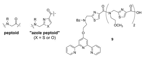 Examples of N-substituted oligoamide scaffolds, peptoids and “azole peptoids” described in this work, and the Zn2+-coordinating thiazole peptoid analog 9.