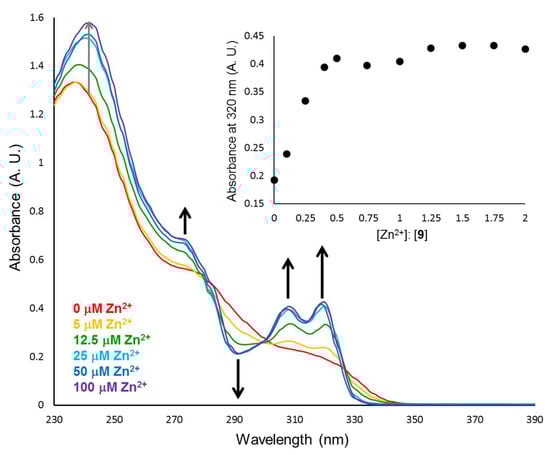 UV-Vis spectra of 50 μM 9 in the presence of varied concentrations of ZnCl2 in 10 mM Tris buffer, pH 7.5. Arrows highlight spectral changes with increasing concentrations of Zn2+. The inset shows the change in absorbance at 320 nm as a function of the [Zn2+]:[9] ratio.