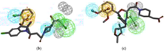 The HipHop pharmacophore models were constructed by extracting the common pharmacological features from the 3D structure features of each compound in the training set [40]. The Principal and MaxOmitFeat values are used to describe the activity of the compounds. The range of “Principle” and “MaxOmitFeat” values are 0, 1 and 2. The “Principal” value is set to 2, representing the superior activity of the compounds. The corresponding “MaxOmitFeat value is set to 0, which indicates that no features that are allowed to be missed for each compound. Then, the “Principal” value is set to 0, indicating the lower activity of the compounds.