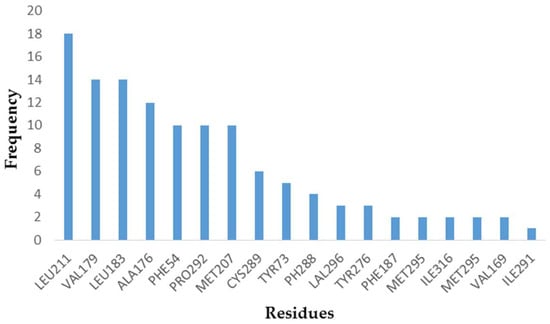 After that, the 22 ligands used in the construction of the pharmacophore model were docked into the binding site of SQS for further demonstrating the key amino acids in receptor-ligand interaction. By counting the frequency of hydrophobic amino acids formed by 22 compounds, the receptor-ligand hydrophobic interactions column diagram shown in Figure 3 was generated. From the result, most of the active compounds could form the hydrophobic interactions with LEU211, VAL179, LEU183, ALA176, PHE54, PRO292, and MET207. This indicated that D99, TAK-475 and the 22 active compounds all could form hydrophobic interactions with PHE54, VAL179, LEU183, LEU211, and PRO292, which were considered to be important key amino acids and used as the reference for selecting potential inhibitors.